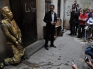 Через полчаса до запланированного времени открытия памятника на площади появился мужчина в черном костюме. Он сообщил журналистам, что памятник уже открыт и установлен в одном из переходов возле Площади Рынок. После этого повел журналистов в пассаж Андреоли.