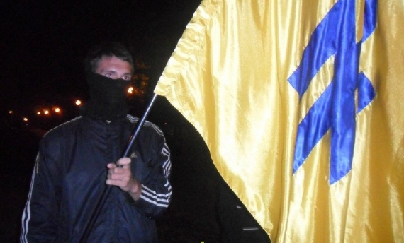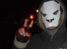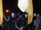 Другие прятали лица за черными повязками. В руках они держали флаги организации "Патриот Украины".