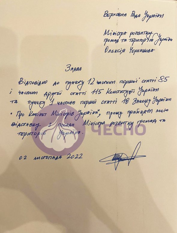 В Верховную Раду подали заявление об увольнении Алексея Чернышева с должности министра развития громад и территорий Украины.
