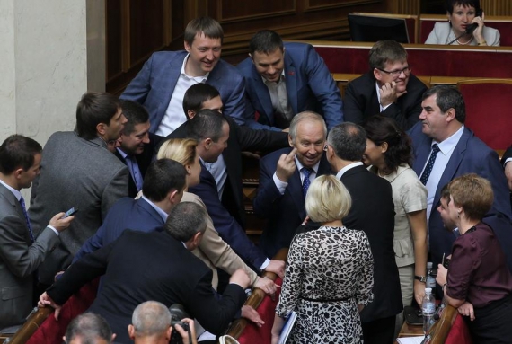 Во время блокирования трибуны и президиума Верховной Рады спикер парламента Владимир Рыбак рассказал несколько анекдотов членам фракции Виталия Кличко "УДАР". Нардепы увлеченно слушали председателя парламента.