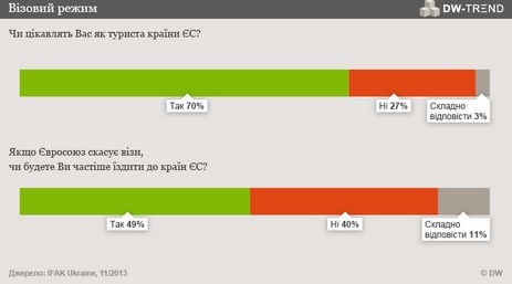 Страны Европейского Союза остаются и в дальнейшем привлекательными целями путешествий для украинского ( 70% ). Если бы не визовые ограничения, туризм бы существенно вырос. 49 % указывают, что ездили в ЕС чаще, если бы для этого им не была нужна виза.