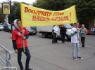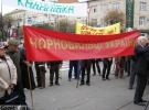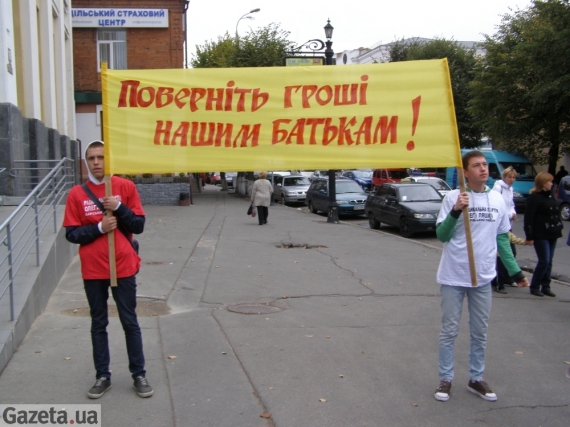 По улице Соборной шагает колонна молодых людей с транспарантами "Верните деньги нашим родителям", "Хватит издеваться над народом", "Чернобыльцам - льготы", "Нас ждет