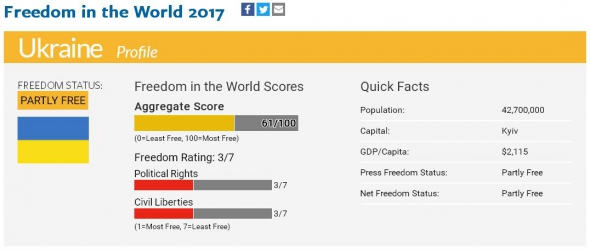 "В категорию "частично свободных" стран Украина попала по показателям по проведению выборов, коррупции, свободы СМИ и законодательства. В течение последних четырех лет Украина сделала большой прорыв. Но, к сожалению, до сих пор пытается восстановиться после коррупции на высшем уровне после устранения от власти Януковича. За коррупцию так и не понесли ответственности. Еще одна проблема в Украине, которую мы продолжаем наблюдать - это политический прессинг и нападения на журналистов-критиков и медиа-организации, что ухудшает ситуацию в СМИ", - цитирует исследователя Freedom House Элен Агекян "Радіо Свобода".