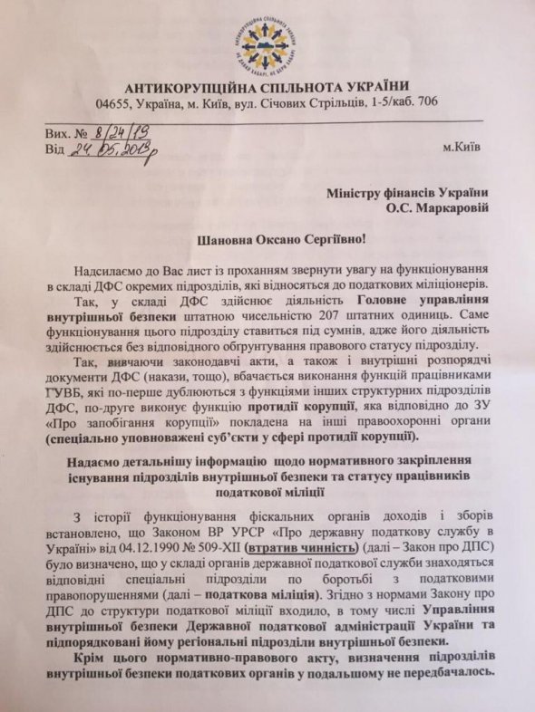 Кабинет Министров может ликвидировать управления внутренней безопасности Государственной фискальной службы Украины. С соответствующим призывом к министру финансов Оксане Маркаровой, председателю реорганизационной комиссии ГФС Александру Власову, руководителям профильных комитетов Верховной Рады Андрею Кожемякину и Нине Южаниной обратились несколько общественных организаций.