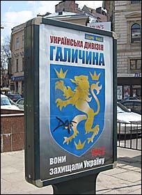 На рекламных щитах написано приветствие в адрес дивизионников "Галичины": "Украинская дивизия Галичина. Они защищали Украину". Также на них изображена эмблема дивизии.