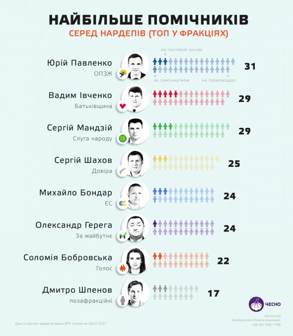 Во фракции "Батькивщина" больше всего помощников у нардепа Вадима Ивченко - 29 Во фракции "слуг" больше всего помощников у нардепов Сергея Мандзия, Святослава Юраша, Юлии Овчинниковой - по 29. У четырех нардепов работает только по одному помощнику.
