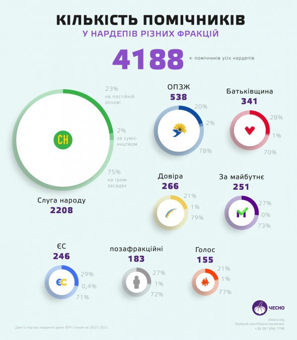 Больше всего помощников во фракции "Слуга народа". Однако если считать количество помощников в среднем на одного нардепа, то больше всего их (14 и 13) во фракциях "Батькивщина" и ОПЗЖ, а также у группы "Доверие". Наименьшее количество помощников на одного нардепа во фракции "Голос" - восемь.