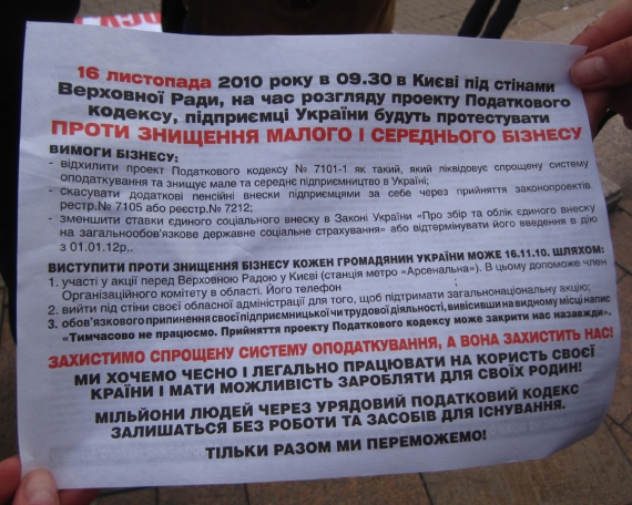 Донецкая предпринимательница Ирина Стороженко, которая выступала во время акции, считает, что "с нового года перестанут существовать как класс и станут безработными 4 млн предпринимателей, которых уничтожит азаровский налоговый кодекс".