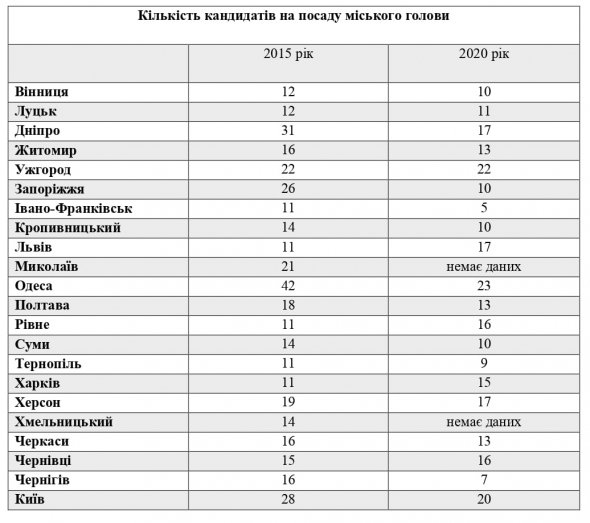Меньше всего претендентов на должность городского главы Тернополя (9), Чернигова (7) и Ивано-Франковска (5).