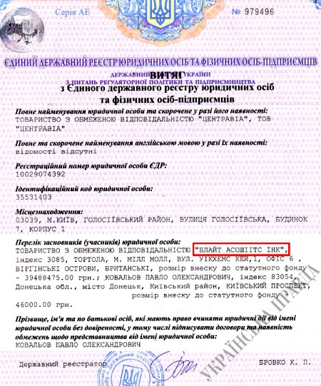 Как говорится в расследовании Украинской правды "Тайна вертолета Януковича спрятана в "Межгорье", главным учредителем ООО "Центравиа" является фирма BLYTHE Associates Inc., которой принадлежит 99,9% акций авиационной компании.