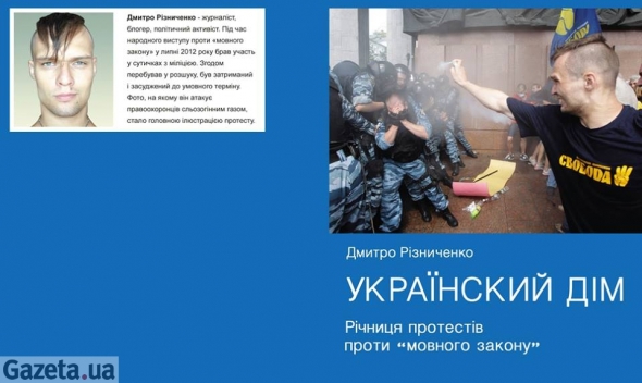 Книгу на заказ членов партии "Свобода" написал беспартийный участник событий - блоггер Дмитрий Резниченко, уроженец Кривого Рога. Именно фото, на котором он брызгает в милиционеров из газового баллона, стало одной из визиток июльских событий 2012 года.