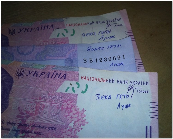 Всего надпись "Зека геть!" фигурирует на гривнах, которые в сумме составляют 7203 грн.
