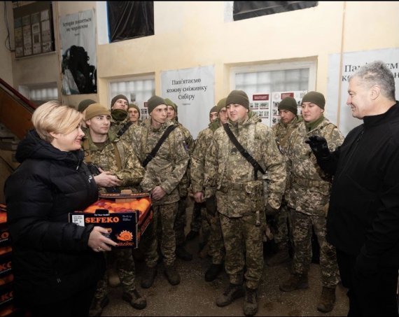 Бывший президент Петр Порошенко с членом своей фракции "Европейской солидарности" Ириной Геращенко уехал на Донбасс. Привезли военным из 25 бригады в Авдеевке комплект видеонаблюдения и разведки, мандарины.