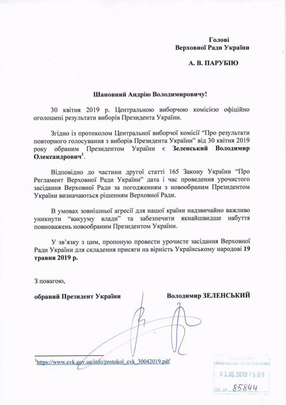 Победитель второго тура выборов президента Украины Владимир Зеленский написал письмо на имя председателя Верховной Рады Андрей Парубия о назначении даты инаугурации.