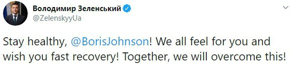 "Оставайся здоровым, Борис Джонсон! Мы все вам сочувствуем и желаем скорейшего выздоровления! Вместе мы это преодолеем!" - написал Зеленский.