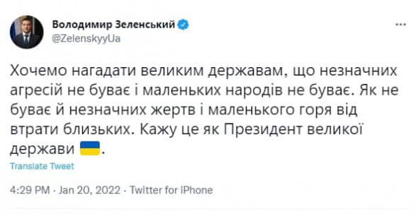 Не бывает также "маленького горя" от потери близких, написал Зеленский 20 января в Twitter в ответ на слова президента США Джо Байдена.