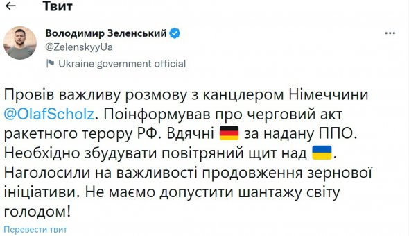 Президент Украины Владимир Зеленский 31 октября созвонился с канцлером Германии Олафом Шольцем и проинформировал его о новых ударах россиян по украинской энергетической сети.