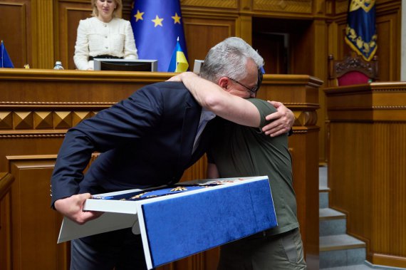 Президент Литвы Гитанас Науседа вручил президенту Владимиру Зеленскому высшую награду государства – орден Витаутаса Великого.