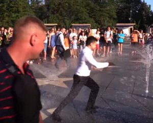Зеленский пробежал через фонтан после своего выступления на Театральной площади по случаю пятой годовщины освобождения города от боевиков ДНР. За ним последовали охранники, а после и обычные люди. Все действие сопровождалось смехом.