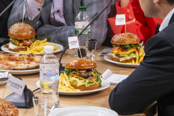 Через несколько минут, пока менялись группы представителей СМИ, на столе появились тарелки с бургерами и картошкой-фри и пицца.