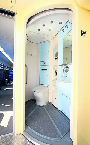 Электропоезд имеет девять вагонов: первого, второго и туристического классов. Вмещает 609 пассажиров. В каждом вагоне — кондиционеры, плазменные телевизоры. Проходы широкие. Над потолком закреплены полки для багажа. Для больших чемоданов — специальное отделение. Возле каждого сидения вмонтированы розетки для мобильных телефонов или ноутбуков. Есть вай-фай. В туалетных комнатах горячая и холодная вода, можно принимать душ.