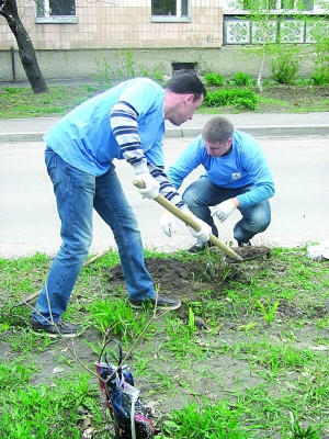 На ул. Ватутина 11 волонтеров компании "Киевстар" и корреспонденты из местных газет копают лунки для роз. Рядом канистры с водой. Готовят к высадке кусты сортов Парадайз, Софи Лорен, Дольче Габбана.