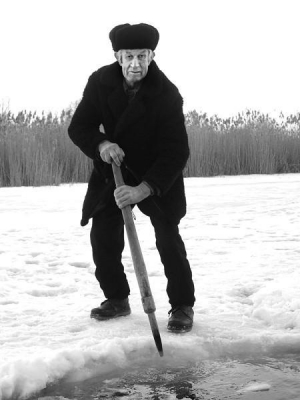 Василий Яковлевич прорубает полынью. Из нее чувствуетяс затхлый воздух.