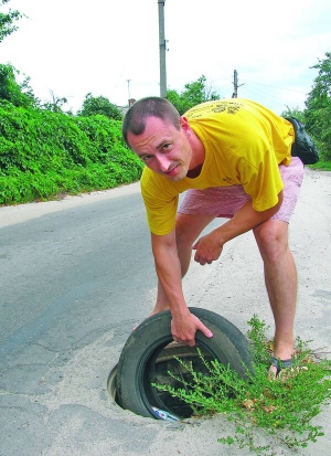 30-летний Вячеслав Тимошенко из поселка Климовка, полтавского микрорайона Левада, втыкает покрышку от автомобиля в канализационный колодец у своего дома на улице 9 Мая. Полгода назад с улицы за одну ночь украли 20 канализационных люков. До сих пор колодцы стоят открытыми. Сначала местные втыкали в них новогодние елки из мусорников. Теперь закрывают дыры досками, автомобильными покрышками, металлическими листами.