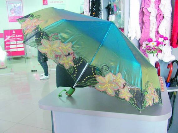 - Ткань водонепроницаемая, покрыта перламутровым напылением, кружево не пропускает воду, - рассказывает продавец Ольга. Торгует зонтами на первом этаже торгово-развлекательного центра "Киев". - Это только по виду кажется, что дождь туда будет стекать. Нравится женщинам. Сейчас вышивка по краям в моде. В прошлом сезоне таких моделей не было.