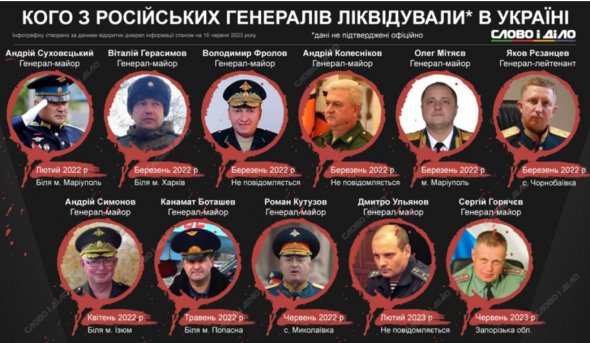 С начала полномасштабного вторжения в Украину ликвидировали, по разным данным, от 10 до более 20 российских генералов. Такие высокие потери эксперты связывают с тем, что из-за проблем с войсками на местах высшему командованию РФ приходится находиться непосредственно на линии фронта. Официально в России редко признают потери такого уровня. По открытым источникам, можно найти данные о 15 ликвидированных генералах.