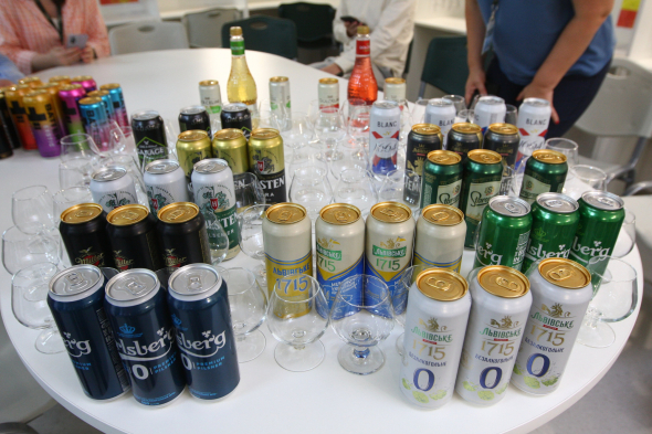 Демонстрирует, как происходит профессиональная дегустация. На большом столе расставили жестяные банки с пивом, которое изготавливают на заводе. Также бутылки с сидром, энергетики. Оксана Галушко говорит, что начинать дегустацию следует с безалкогольных напитков. Расставляет стаканы, считающиеся коньячными.