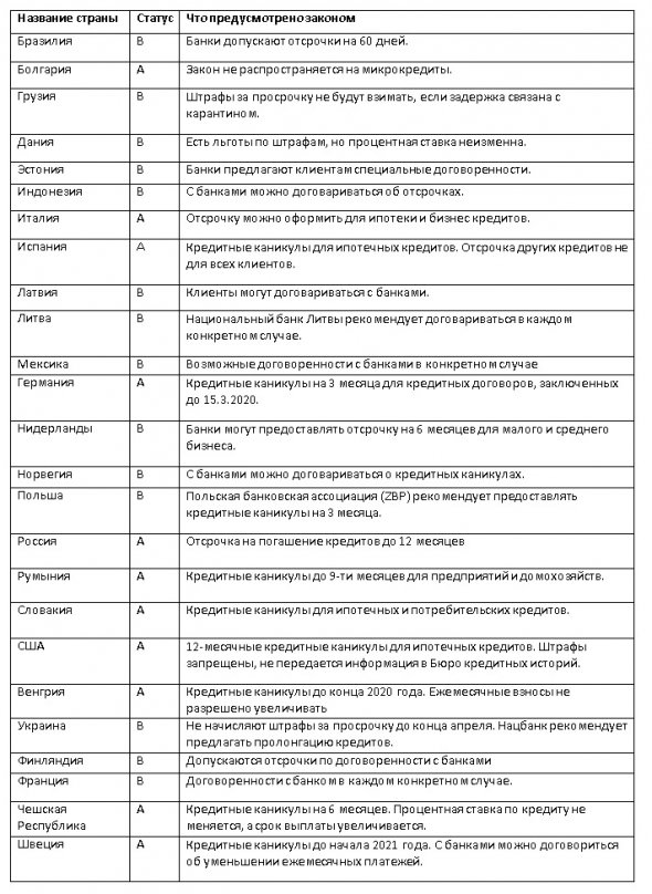 Через карантинные ограничения много людей в разных странах мира страдают из-за потери доходов, имеют проблемы с финансами и не могут выплачивать кредиты во время карантина. Правительства стран вынуждены вмешиваться в ситуацию чтобы смягчить кризис в финансовом секторе и помочь гражданам и бизнесу решить проблемы с кредитами. Самые распространенные меры, к которым прибегли в разных странах - объявления кредитных каникул для населения и бизнеса и рекомендации для банков по пересмотру условий погашения кредитов во время карантина.