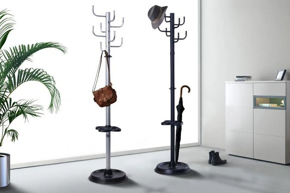 • напольные — бывают трех видов. Первый — в виде плечиков, они называются "прикроватные", иногда бывают в виде декоративной лестницы. Второй — в виде вертикальной оси, вокруг которой крепятся крючки для одежды. Третий — в виде стеллажа с перекладиной для тремпелей и полками для аксессуаров.