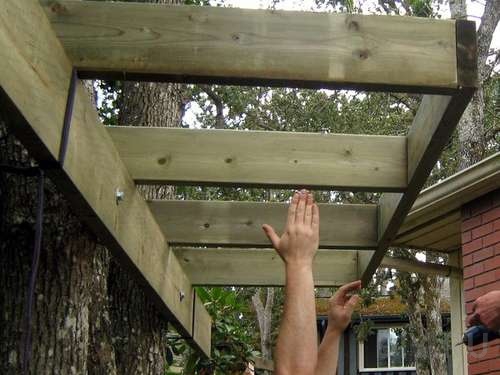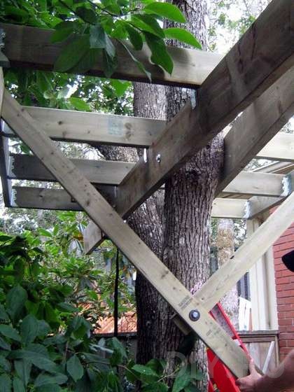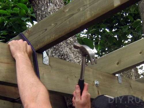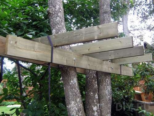 С помощью 75-миллиметровых шурупов прикрепите четыре доски (те, что короче на 100 мм ) к одной длинной доске 50*150 мм. Разместите короткие доски перпендикулярно на одинаковом расстоянии, убедитесь, что заготовленная рама наденется на ветки дерева поверх опорных балок. Попросите кого-то помочь и поднимите раму на дерево. Выровняйте раму и зафиксируйте, привязав канатом к опорным балкам.