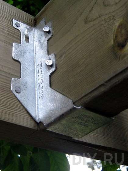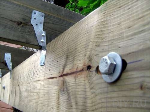 Прикрепите платформу к опорным балкам. Сделать это проще всего с помощью металлических пластин с отверстиями. На углы платформы установите закрепы. Весь крепеж должен быть оцинкованным.