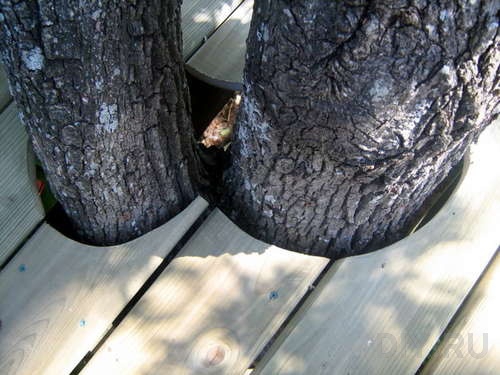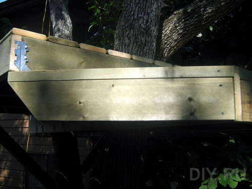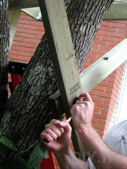 Поднимитесь на платформу и закрепите настил. Здесь нет ничего сложного, но в досках придется делать вырезы, сквозь которые пройдут ветки. Зазор между досками и ветками должен быть около 20-50 мм.