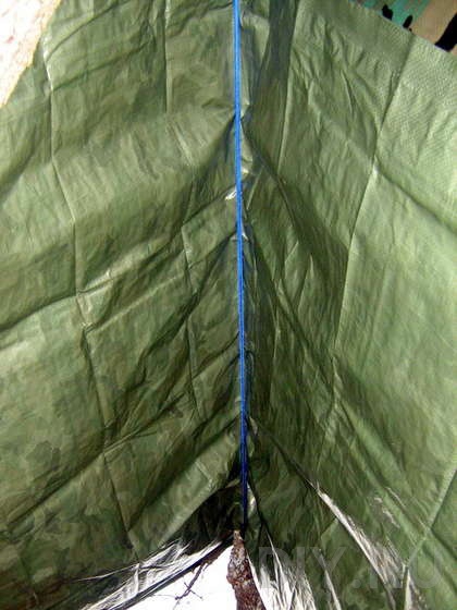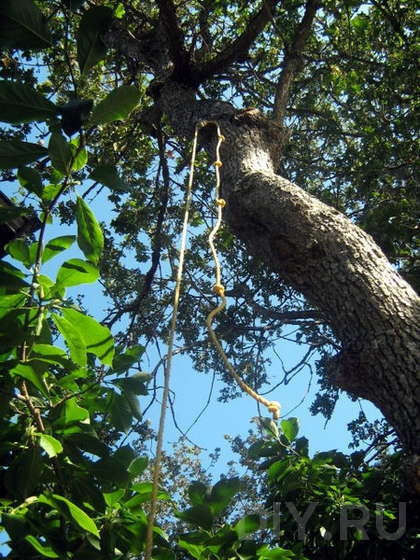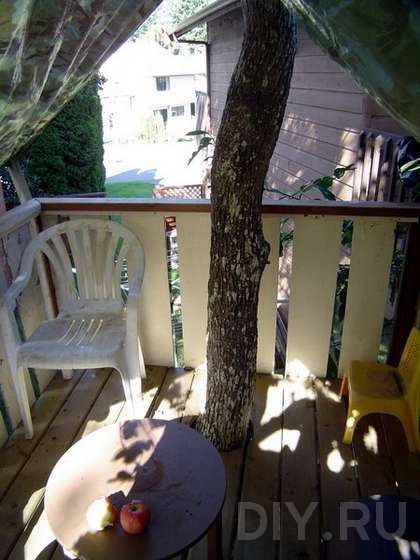 Крыша. На высоте чуть больше 2 метров над платформой в ветки ввинтите два крюка. Между ними натяните трос. Перебросьте через трос кусок брезента. К перилам прикрутите подпорки, которые немного поднимут нижние края крыши. Маленький домик на дереве готов.
