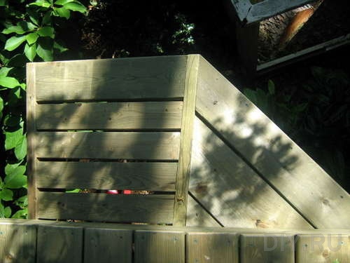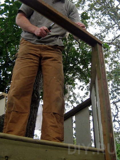На каждом углу платформы установите по метровой стойке из бруса 50*100 мм. К стойкам шурупами прикрутите перила из такого же бруса. Углы перил запилите торцовочной пилой или ножовкой под 45 градусов.