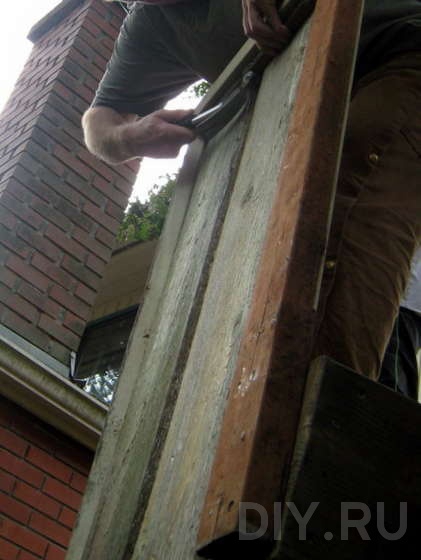Повесьте блок с веревкой. Лебедку можно оставить, чтобы дети могли поднимать на дерево игрушки, но и на этапе строительства это приспособление будет нам очень кстати. Протяните через блок веревку, к одному концу привяжите карабин и повесьте ведро. Для крепления блока нужно выбрать подходящую ветку. Если такой ветки нет, придется закрепить на стволе балку. Балку нужно расположить довольно высоко над платформой и надежно закрепить с помощью шурупов. Вылет балки должен быть достаточно большим. Можно поступить хитрее, взяв длинную балку, которая будет одновременно коньком крыши.