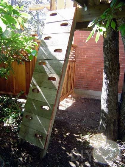 Лестница. Можно повесить веревочную лестницу, но такой вариант не подойдет для маленьких детей. Можно изготовить что-то наподобие альпинистской стенки. Для этого под углом установите два бруса, к ним вплотную друг к другу прибейте дощечки. Если есть возможность, купите специальные зацепы или просто выпилите ступени. Для этого просверлите несколько отверстий по периметру, а затем сделайте пропилы с помощью сабельной пилы или маленькой ножовки. Задача существенно упростится, если у вас в хозяйстве есть фрезер. Кромки отверстий обработайте наждачной бумагой.