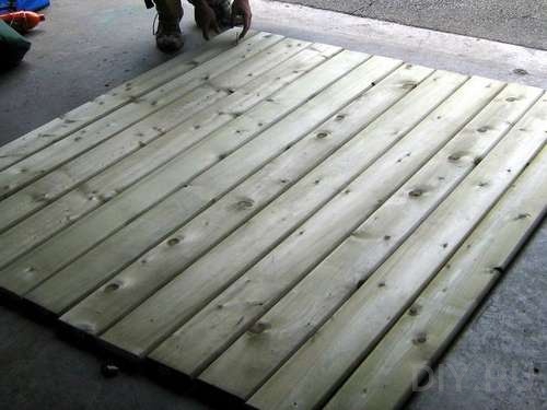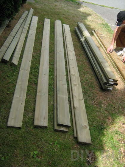 Нарежьте доски для настила нужной длины. Между досками нужно оставить зазоры около сантиметра. Отверстия будут служить для дренажа. Отрежьте две доски 50*150 соответствующие длине настила, четыре других доски сделайте немного короче, обрезав от каждой 100 мм.