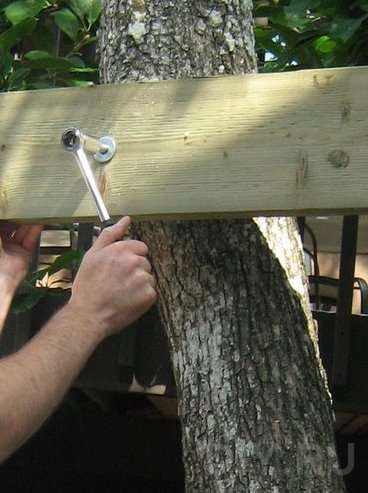 Закрепите опорные балки на ветках с помощью шурупов и разводного ключа. Отверстия под шурупы у вас уже заготовлены. Не прикручивайте доски вплотную к веткам. Установите распорки.