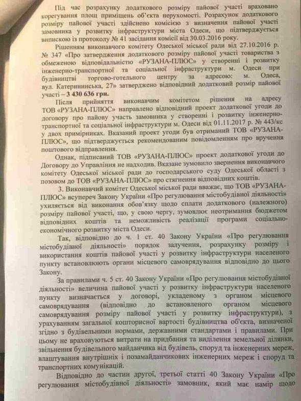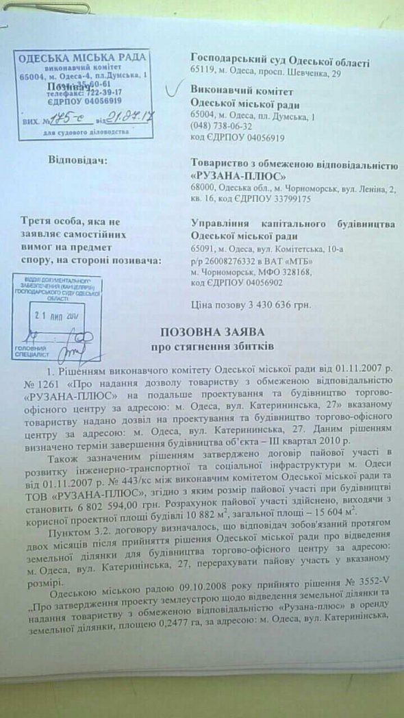 В соответствии с текстом иска, компания "Рузана-Плюс" еще в 2007 году получила разрешение Одесского горсовета на проектирование и строительство в историческом центре Одессы, на улице Екатерининской, 27 торгово-офисного центра, который в последствие превратился в торговый центр "Kadorr".