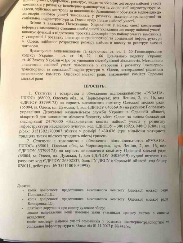 Исполнительный комитет Одесского городского совета обратился в Хозяйственный суд Одесской области с исковым заявлением о принудительном взыскании 3 млн 430 тыс 636 грн с ООО "Рузана-Плюс". Третьей стороной в судебной тяжбе выступает Управление капитального строительства Одесского городского совета.