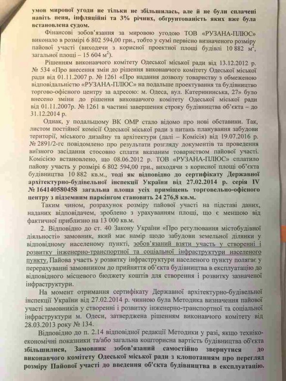 Одним из пунктов данного договора компания "Рузана-Плюс" обязалась принять паевое участие в создании и развитии инженерно-транспортной инфраструктуры города. Это стандартное обязательство всех договоров на разрешение проведения строительных работ, закрепленное законодательством Украины. Еще в 2012 году ООО "Рузана-Плюс" уплатила городу свою долю паевого участия – 6 млн.802 тыс 594 грн, исходя из полезной площади объекта строительства в 10 882 кв.м. Но, как впоследствии выяснилось,в ходе строительства первоначальный проект здания был существенно изменен. И вместо 10 882 кв.м. на самом деле торговый центр "Kadorr" размещается на 24 276,8 квадратных метрах площади. То есть известный своей "предприимчивостью" сирийский бизнесмен фактически незаконно увеличил площадь торгового комплекса более чем в два раза. Об этом свидетельствует сертификат Государственной архитектурно-строительной инспекции Украины от 27.02.2014 г. серия IV №164140580458. О таком вот двукратном увеличении площади торгового центра ООО "Рузана-Плюс" власти города не уведомила, копию нового техпаспорта так и не предоставила.