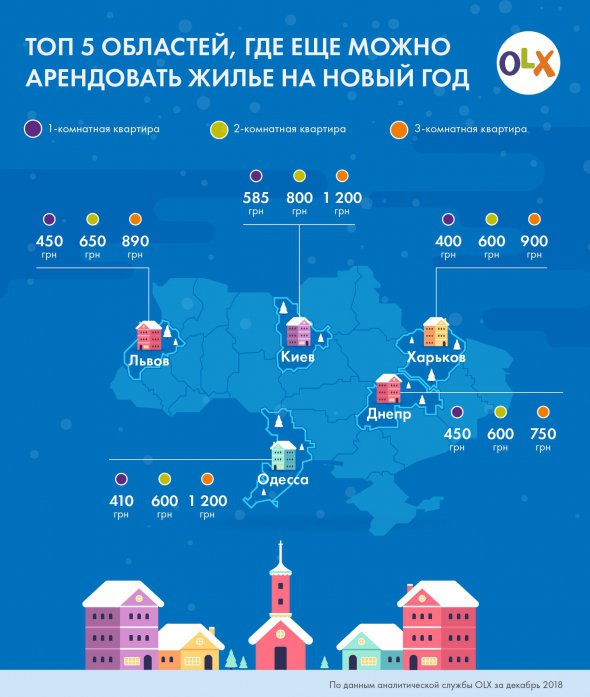 Больше всего предложений аренды жилья на новогодние праздники в Киеве и области. Однокомнатная столичная квартира стоит около 585 грн. Двухкомнатная дороже - 800 грн. Дешевле всего в столице арендовать хостел - 120 грн в сутки с человека.
