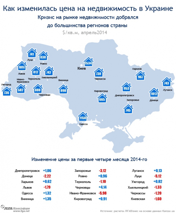 Если смотреть на динамику цен с начала 2014 года, то изменение не столь драматичны - больше всего цена квадратного метра снизились в Ивано-Франковске на 6%, а выросла в Черновцах - на 4%.