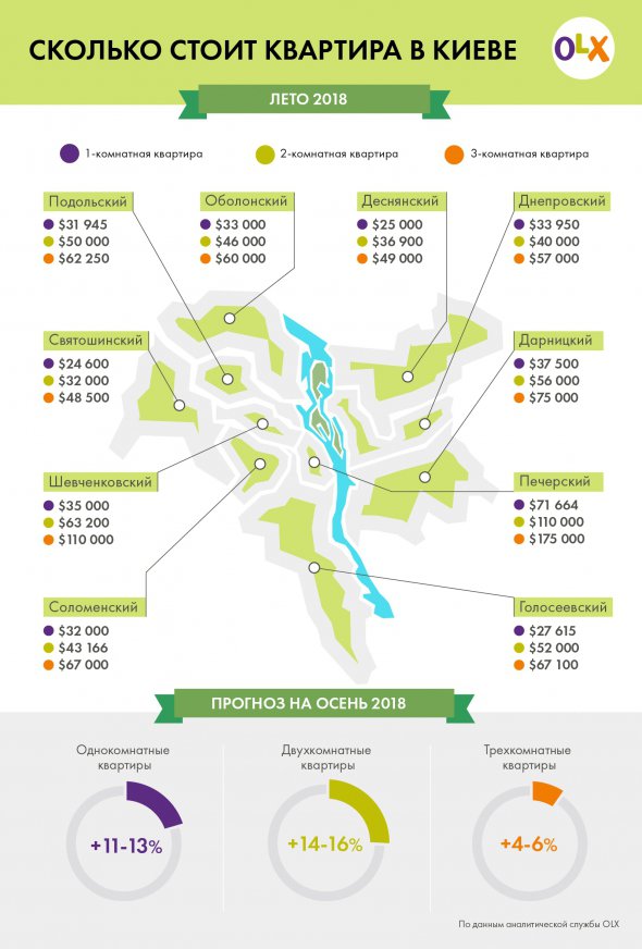 Двухкомнатная квартира в Деснянском районе в среднем стоит до $37 тыс. За $40-56 тыс. можно найти варианты на левом берегу в Днепровском и Дарницком районах. Такие же цены на правом берегу в Подольском, Голосеевском, Оболонском и Соломенском районах.