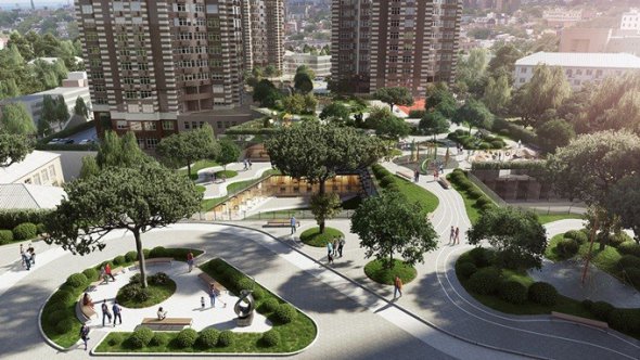 Это всего лишь немного измененная концепция удобного дворика для ЖК. Здесь много деревьев, а вместо асфальта – газоны.