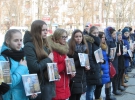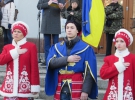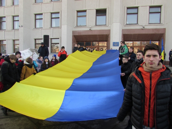 В Полтаве возле областной государственной администраций вспомнили погибших в Революции достоинства. Принесли 10-метровый национальный флаг и пели гимн.